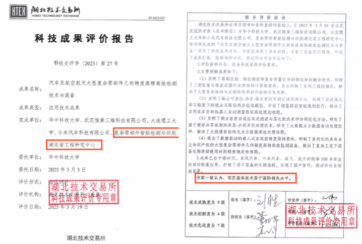 近日,湖北省工程研究中心传来振奋人心的消息:由该中心参与完成的《汽车及航空航天大型复杂零部件几何精度高精高效检测技术与装备》项目,经湖北技术交易所组织权威专家鉴定,被正式评价为整体技术居于国际领先水平(鄂技交评字[2025]第27号)。这一标志性成果,标志着我国在高端制造检测领域实现了从跟跑到领跑的历史性跨越。